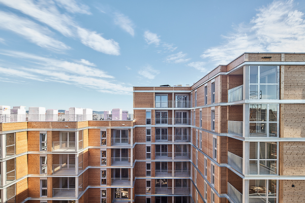 Große Fensterflächen, viele Ecksituationen und klar gegliederte Loggien sorgen für helle Wohnräume und ein angenehmes Raumklima. Nahezu alle Einheiten verfügen über private Freiräume wie Loggien oder Balkone, die durch die klare modulare Struktur elegant in das Fassadenbild integriert sind. Ergänzt werden die Baukörper durch begrünte Dach- und Fassadenflächen, die sowohl gestalterisch als auch ökologisch eine wichtige Rolle spielen.